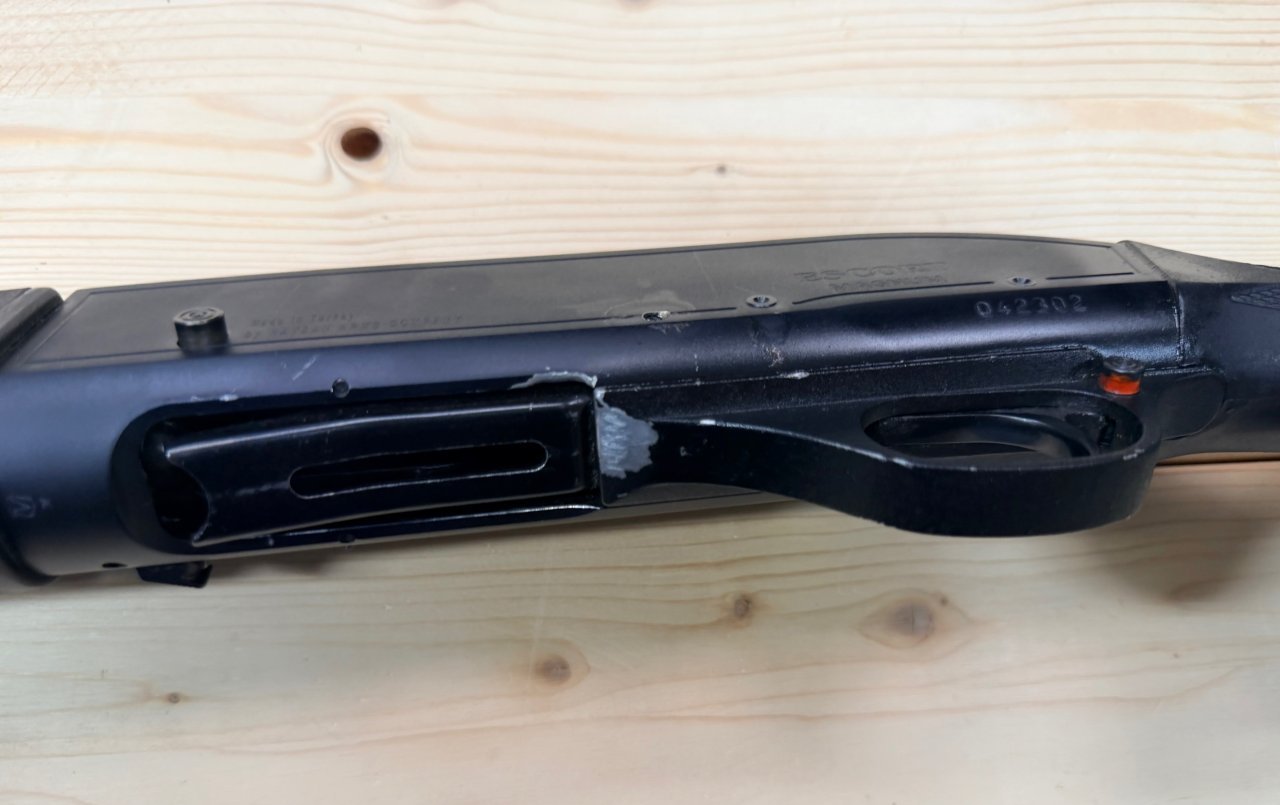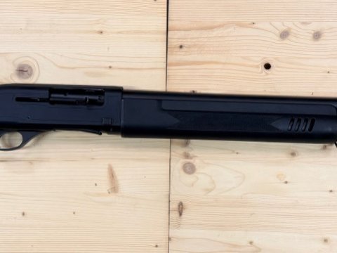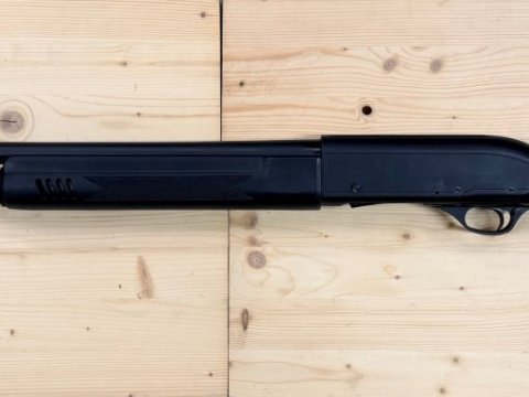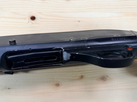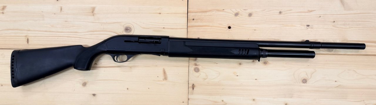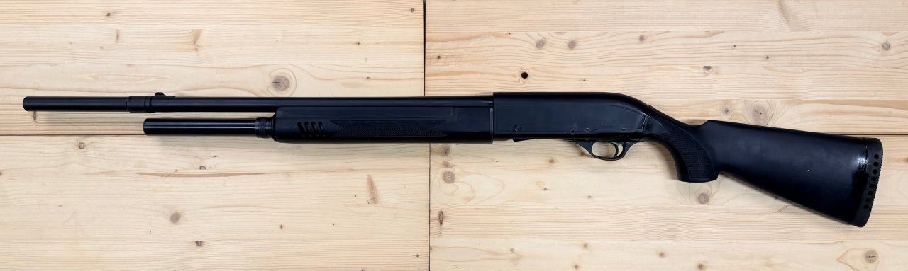 | Samonabíjecí brokovnice ráže 12x76mm s nástavcem zásobníku a prodlouženým, venkovním zahrdlením. Používaná, ale bez výrazného opotřebení. | |