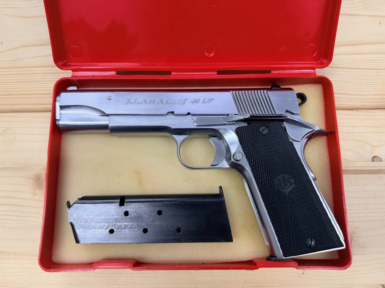| Samonabíjecí pistole Llama, Model: MAX-I, Ráže: .45 ACP, klon 1911 v chromovaném provedení se 2ks zásobníků. Použitá, bez zjevných známek nadměrného opotřebení | |