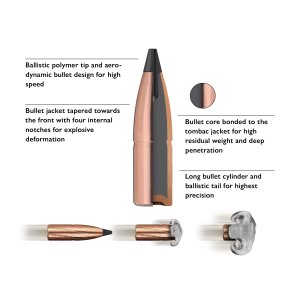 Díky inovativní konstrukci se zúženým pláštěm a spojeným (bonded) jádrem nabízí střela vynikající průbojnost a zajišťuje spolehlivý zásah s minimálním poškozením zvěřiny.