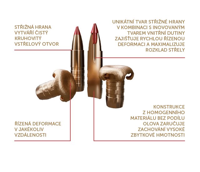 Plastová špička zajišťuje řízenou deformaci v jakékoliv vzdálenosti. Konstrukce z homogenního materiálu bez podílu olova zaručuje zachování vysoké zbytkové hmotnosti.