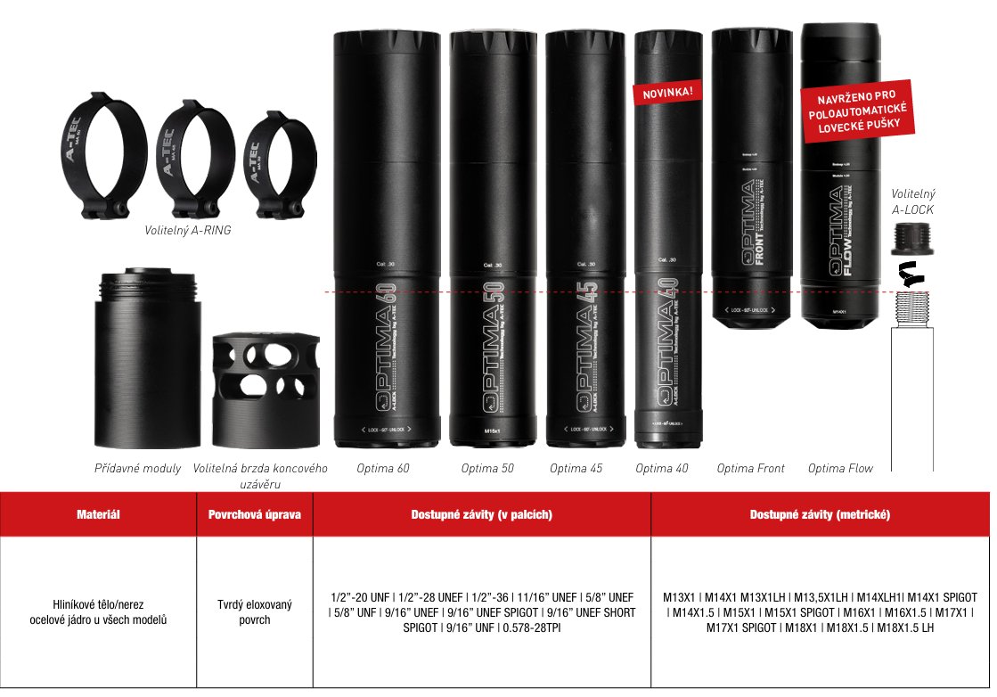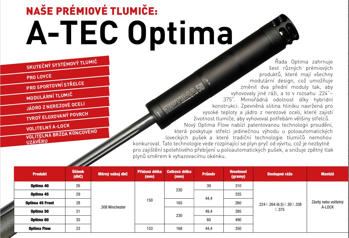A-TEC Optima představuje rodinu modulárních tlumičů navržených pro moderní lovecké a sportovní zbraně. Nízká hmotnost, výkonné vnitřní jádro a vyměnitelné přední moduly umožňují jeden tlumič použít pro různé ráže. Varianta Optima Flow s technologií A-FLOW je speciálně vytvořena pro samonabíjecí pušky a výrazně snižuje blow-back plynů do závěru.