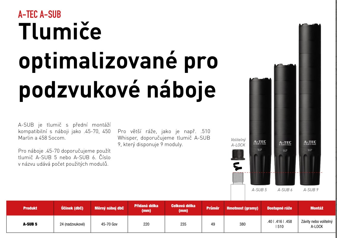 A-TEC SUB 5 je vysoce výkonný, modulární tlumič navržený pro zbraně v ráži až do .458" (11,65 mm). Konstrukce byla optimalizována pro maximální účinnost jak u subsonických, tak i u supersonických konfigurací, přičemž bere v úvahu nižší úsťové rychlosti, které bývají u některých velkorážových nábojů běžné. Díky modulárnímu provedení můžete upravovat vnitřní objem a akustický profil tlumiče podle používané munice a požadovaného kompromisu mezi hmotností a útlumem.